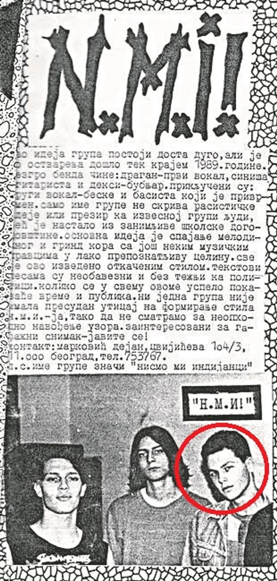 - U to vreme sam živeo u zgradi u Cvijićevoj ulici, bubnjar Dejan je živeo na prvom, a ja na trećem spratu. Sa trećim članom benda, pevačem, išao sam zajedno u Petu gimnaziju. Slušali smo sličnu vrstu muzike i rešili da osnujemo bend koji smo nazvali N. M. I. (Nismo mi indijanci) - priča Mali.