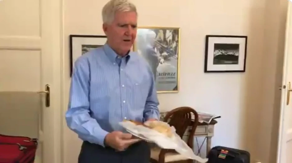 Snimak se završava tako što je na nalepnici za bagaž na kojem je ispisano njegovo ime slovo "o" u njegovom prezimenu prepravio u "a", jer tako je, kako tvrdi, pravilno.