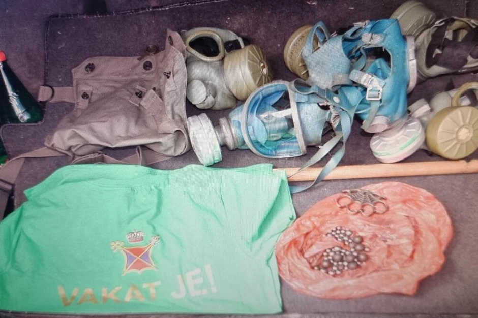 "Daljim pregledom vozila pripadnici policije su pronašli šest zaštitnih maski, tri biber spreja, metalni boks, drvenu palicu, 62 metalne kuglice i majice", saopšteno je iz Uprave policije.
