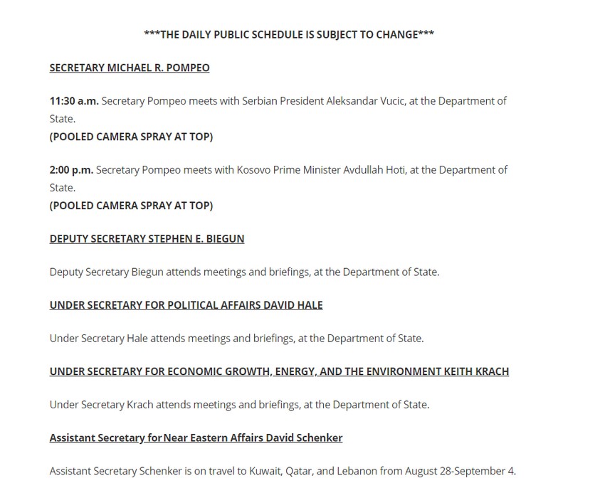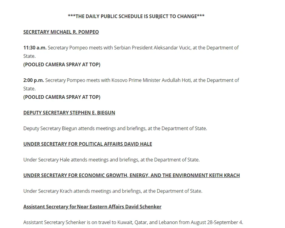 Američki državni sekretar Majk Pompeo sastaće se u odvojenim susretima sa predsednikom Srbije Aleksandrom Vučićem i premijerom privremenih kosovskih institucija Avdulahom Hotijem.