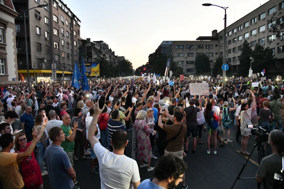 Saobraćaj ispred Skupštine bio je blokiran nešto pre 19 sati. U tom trenutku na platou se bilo okupilo oko 200-300 ljudi, a još toliko je potražilo zaklon od sunca u Pionirskom parku.