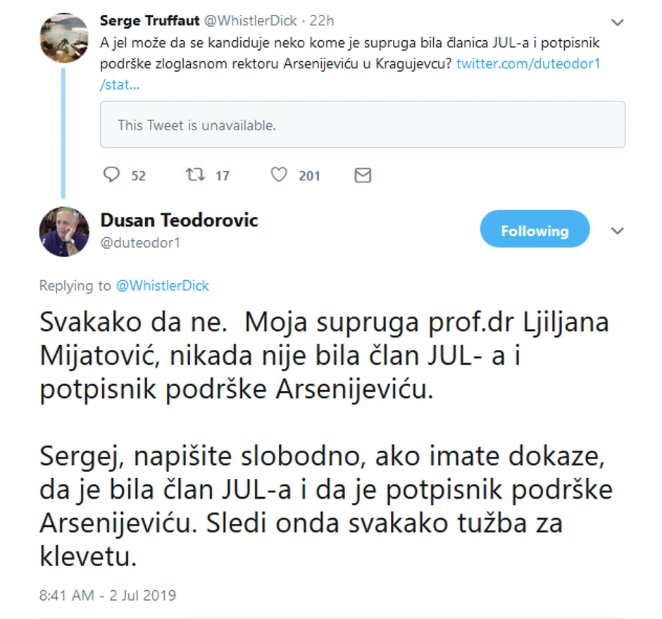 Takođe, upitao je, sugerišući na Teodorovićevu suprugu, da li "može da se kandiduje neko kome je supruga bila članica JUL i potpisnikpodrške zloglasnom rektoru Arsenijeviću u Kragujevcu?".