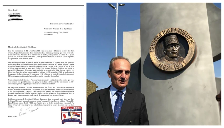 Pjer Tranije, praunuk francuskog generala iz Prvog svetskog rata, uputio je pismo predsedniku Francuske Emanuelu Makronu, u kojem osuđuje skandalozni protokol obeležavanja veka od kraja rata i način na koji je dočekan predsednik Srbije Aleksandar Vučić, objavio je Savez Srba Francuske.
