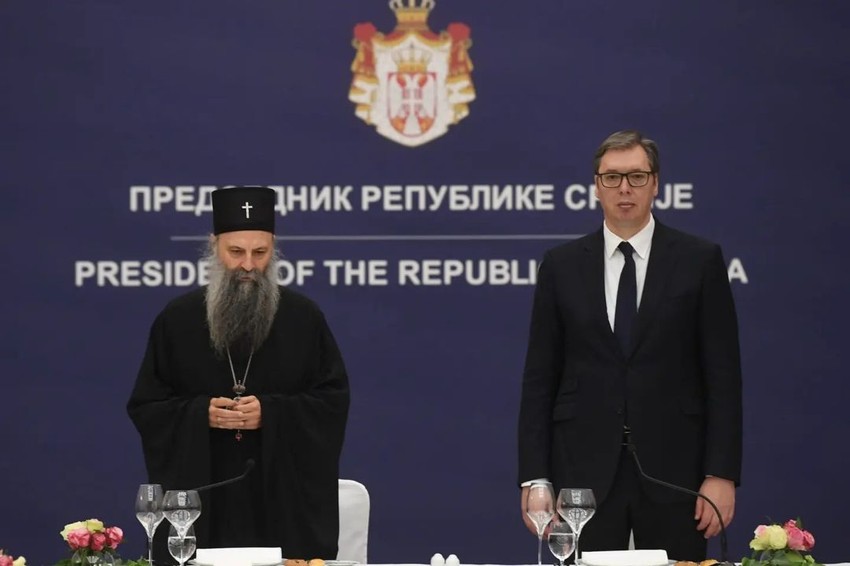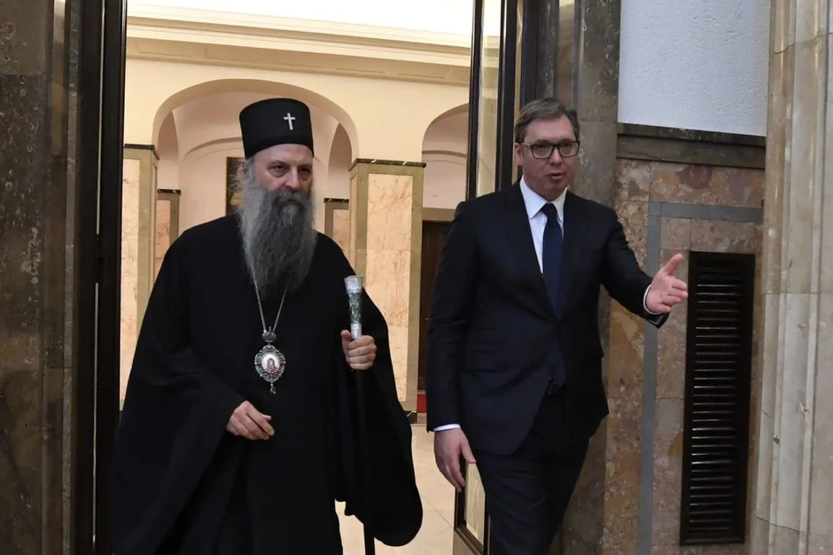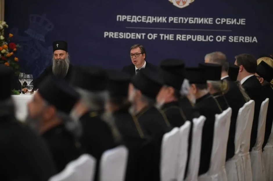 Predsednik Srbije Aleksandar Vučić ugostio je patrijarha Srpske pravoslavne crkve Porfirija i episkope SPC u zgradi Generalnog sekretarijata predsednika Republike.