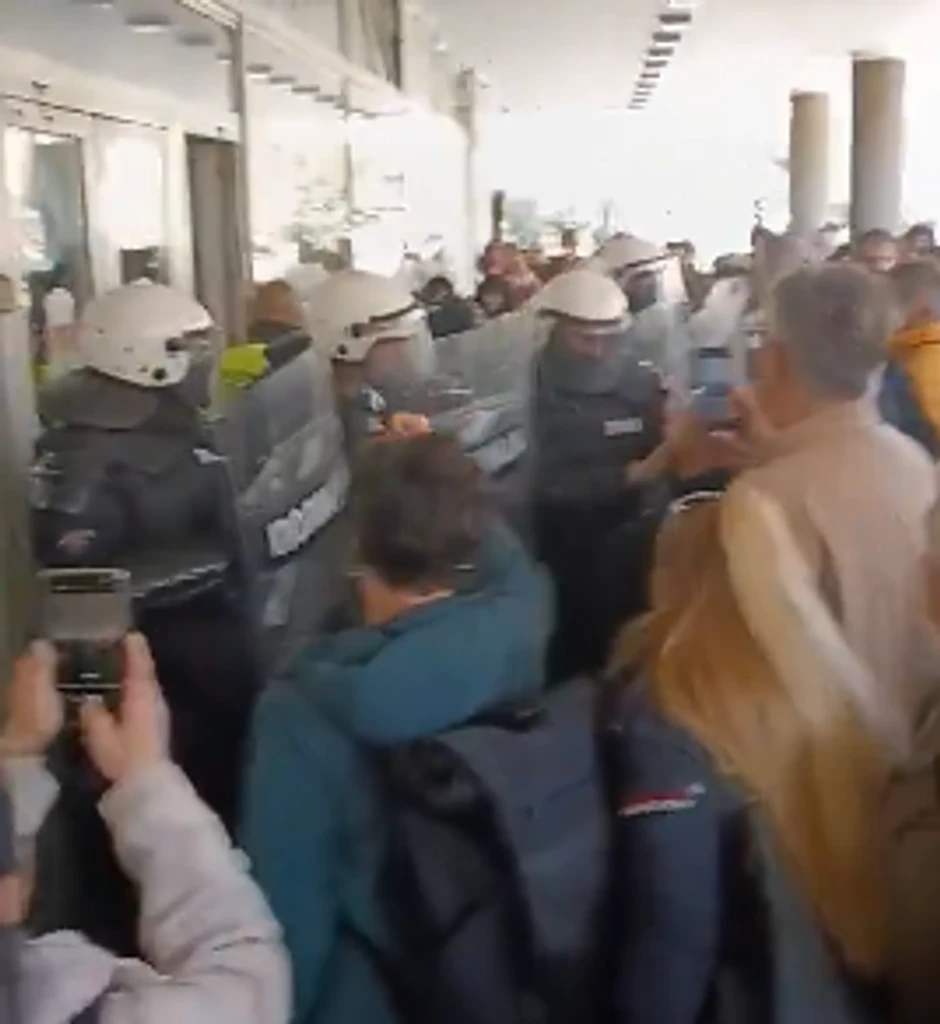 Ulaz u skupštinu je blokiran, a atmosfera tenzična jer je došlo do guranja između policije i građana.