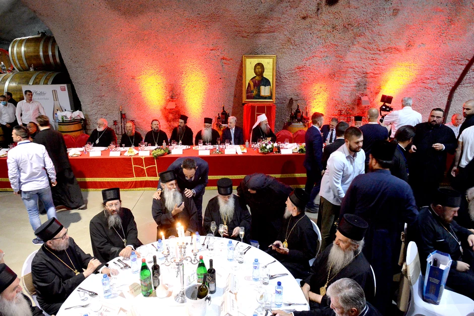 Za glavnim stolom u autentičnom restoranu kompanije Platanže u čelu sede patrijarh Porfirije, sa njegove desne strane je premijer Zdravko Krivokapić, a sa leve mitropolit Joanikije. Za glavnim stolom je i ministar u Vladi Srbije Nenad Popović, javio je izveštač Tanjuga sa llica mesta.