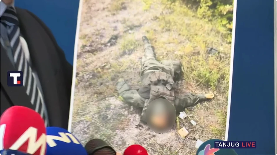 - Pitanje obdukcije je ključno, posebno kako je ubijen Bojan Mijailović. Imam fotografiju ubijenog Mijailovića. Ono što su nam rekli naši patlozi na osnovu ove fotografije tvrde da je ulazna rana u predelu levog kapka, a izlazna gde je rupa sa desne strane glave, što jasno govori da je egzekucija izvršena licem u lice dok je ležao na leđima. Desna noga je u nepravilnom položaju, što govori da je on prvo ranjen, pao je i onda je izvršena egzekucija - kaže Petar Petković, direktor Kancelarije za KiM na konferenciji za medije.