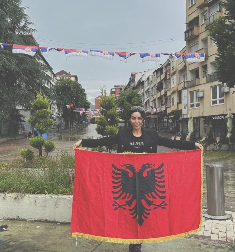Albanska pevačica sa Kosova Fjola Morina pozirala je u blizini mosta na Ibru u severnom delu Kosovske Mitrovice sa albanskom zastavom u rukama i porukom „Sve albansko je naše“.