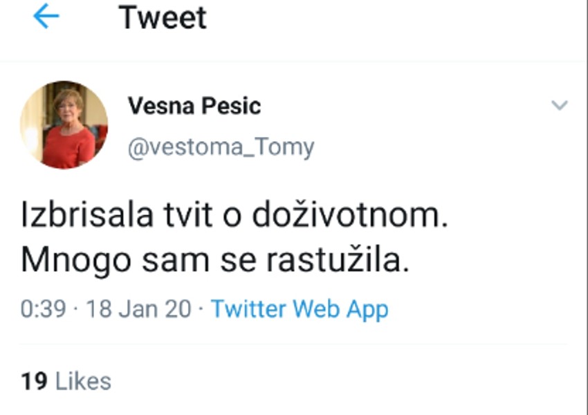 - Izbrisala tvit o doživotnom. Mnogo sam se rastužila - napisala je ona u kasnijoj objavi.