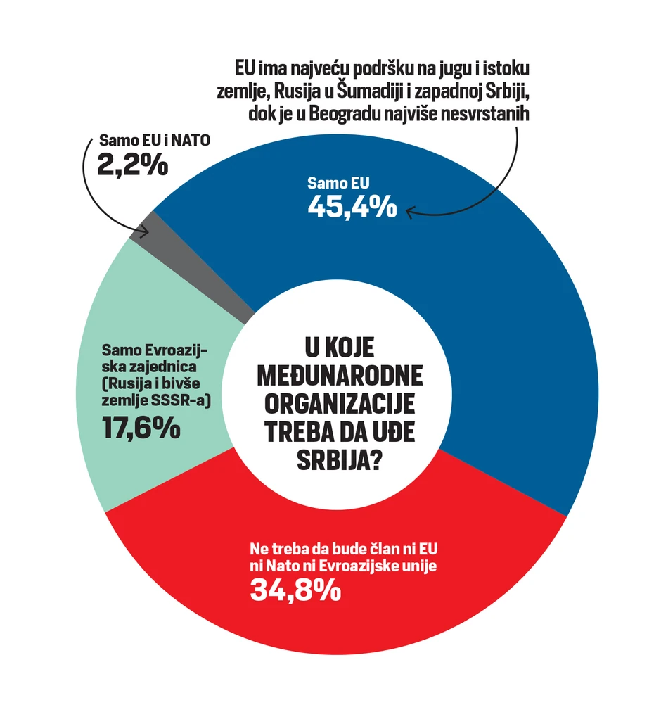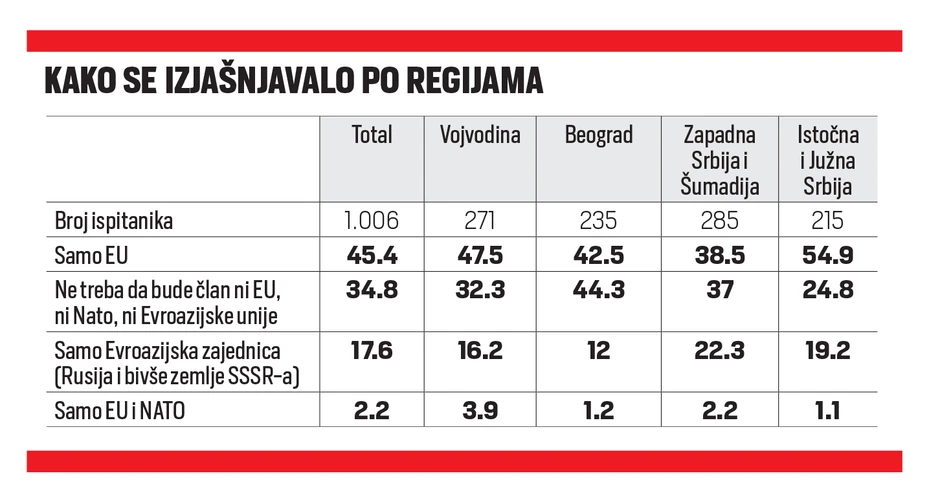 "S druge strane, Beograđani su statistički za nesvrstavanje Srbije u saveze, ali i najmanje podržavaju članstvo Srbije u Evroazijskoj zajednici sa Rusijom. Stanovnici Šumadije i zapadne Srbije su više od drugih delova Srbije za članstvo Srbije u istočnom savezu. Među žiteljima Vojvodine koji su učestovali u istraživanju je prisutna veća podršaka članstvu Srbije i u EU i NATO, ali je ona i dalje mala", pokazalo je istraživanje.