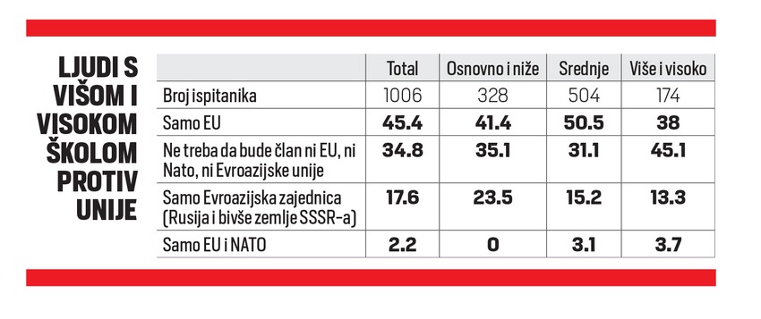 "Članstvo Srbije u EU je najzastupljeniji spoljnopolitički prioritet i kod ispitanika koji imaju srednje obrazovanje. Ipak, za razliku od njih, ispitanici koji imaju više i visoko obrazovanje smatraju da Srbija treba da ostane i van istočnih i van zapadnih integracija. Ovaj stav je statistički znatnije prisutan kod ove grupacije nego na nivou čitavog uzorka od 1.006 ispitanika", navodi se u istraživanju.