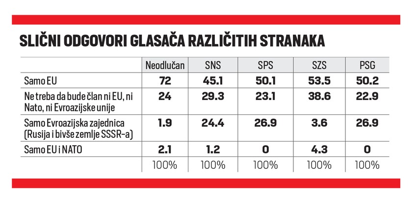 "Posmatrajući po izbornom ponašanju, sedam od deset neodlučnih ispitanika (koji ne znaju za koga bi ili ne bi ni za koga glasali) za članstvo je Srbije u EU. Među glasačima SNS taj procenat je 45 odsto, uz 29 odsto onih koji su za neutralnost i 25 odsto za Evroazijsku zajednicu. Relativno sličan odnos je kod SPS-a. Slično viđenje spoljne politike Srbije imaju i glasači Pokreta slobodnih građana, dok se kod glasača Saveza za Srbiju dele na one koji su za članstvo u EU, njih 53,5 odsto, i onih koji su za nesvrstavanje 38,6 odsto", navodi se u istraživanju.