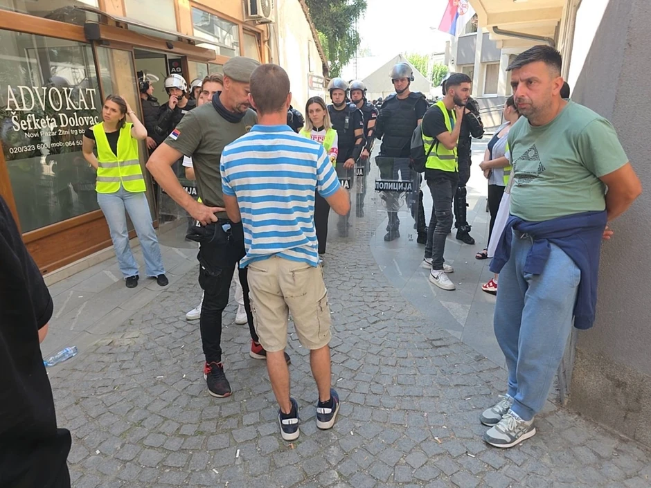 - Policijski službenici PU Novi Pazar potisnuli su bez upotrebe sredstava prinude okupljene građane kod sporednog ulaza u zgradu Osnovnog suda u Novom Pazaru kada je, u jednom trenutku, došlo do guranja okupljenih sa policijom, koja je angažovana sa zadatkom da omogući zaposlenima da uđu u sud - stoji u saopštenju PU Novi Pazar.