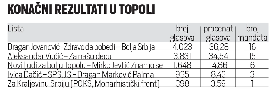 Verovatno najneizvesnija borba za vlast nakon parlamentarnih i lokalnih izbora u Srbiji vodi se u Topoli, pošto ni ponovljeno glasanje prekjuče na dva biračka mesta (Topola bioskop i selo Šatornja) nije dalo odgovor na pitanje ko će i s kim napraviti vladajuću koaliciju. Štaviše, trka za većinom u lokalnoj skupštini postala je još neizvesnija jer listu Dragana Jovanovića "Pomozimo Draganu - Zdravo da pobedi - Bolja Srbija" i listu SNS-a deli samo jedan mandat.