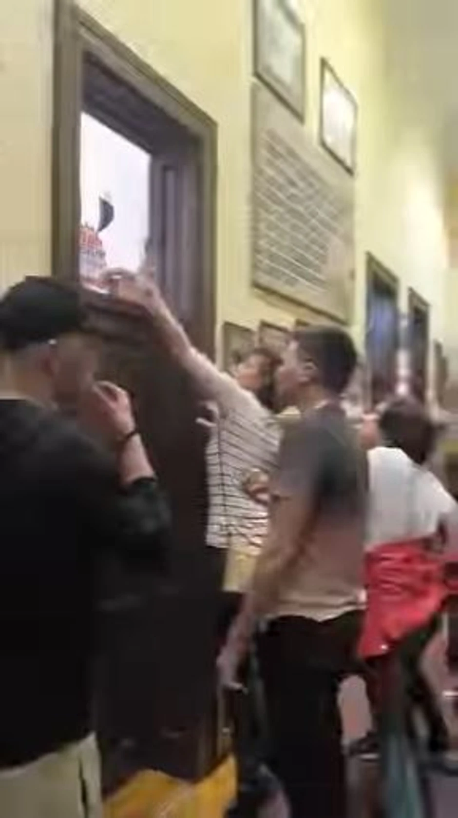 Na jednom od snimaka profesori kucaju na vrata kancelarija, a skandira se i „Izlazi napolje“ i „Ostavka, ostavka“.
