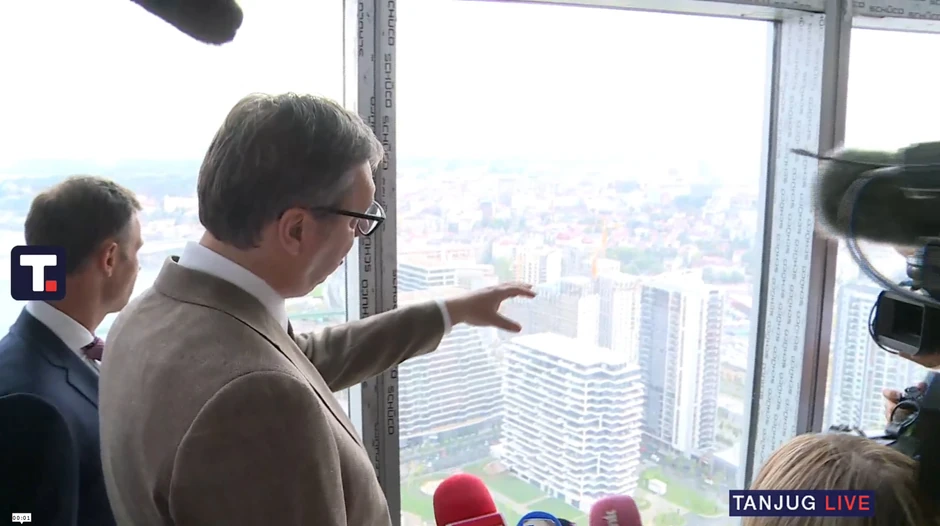 - Čuo sam da je neko ponudio 15 miliona evra za ceo sprat u kuli - rekao je Vučić na početku obilaska, gde mu društvo prave ministar finsnija Siniša Mali i gradonačelnik Beograda Aleksandar Šapić.