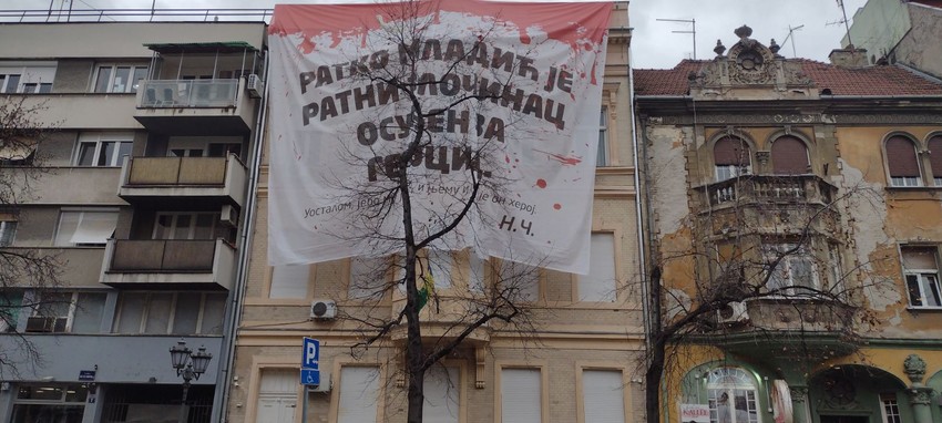 Veliki pano okačen je jutros na zgradu koja je sedište LSV. Na njemu je velikim slovima bilo ispisano: "Ratko Mladić je ratni zločinac osuđen za genocid", ispod čega je nešto sitnije pisalo: "Uostalom, j**o mu ja mater, kao i onome kome je on heroj", i na kraju inicijali N. Č.