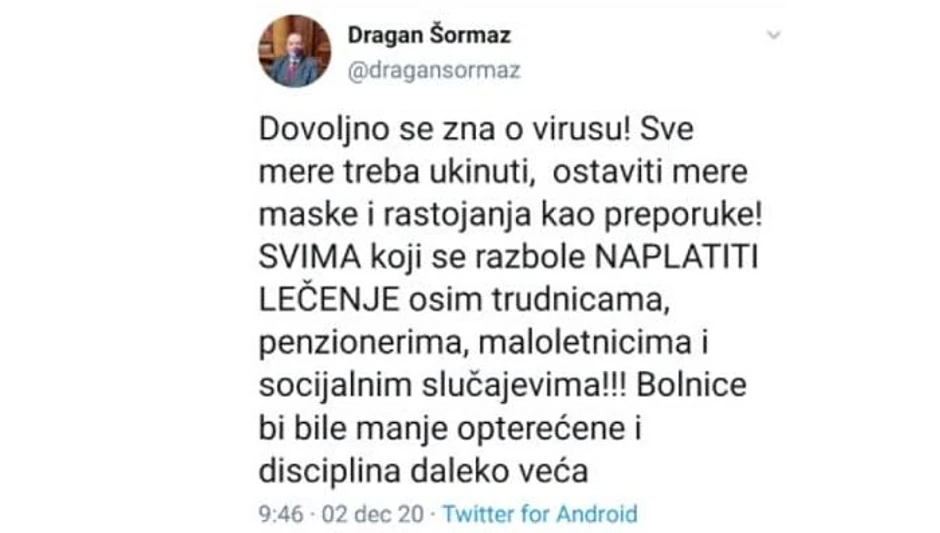 - Dovoljno se zna o virusu! Sve mere treba ukinuti, ostaviti maske i rastojanja kao preporuke. Svima koji se razbole naplatiti lečenje, osim trudnicama, penzionerima, maloletnicima i socijalnim slučajevima! Bolnice bi bile manje opterećene i disciplina daleko veća - napisao je Šormaz na Tviteru, ali je nedugo zatim isti tvit obrisao.