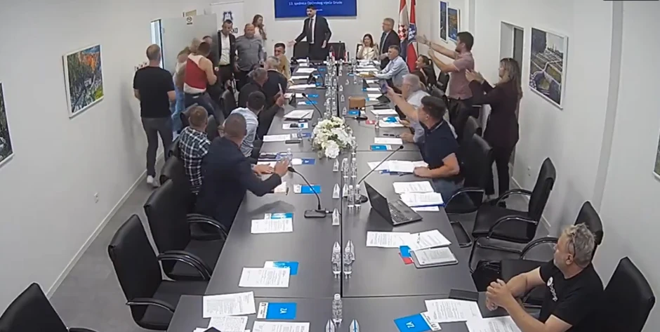 Nesvakidašnje scene zabeležene su danas u Grudama, gde je zastupnik u Skupštini Zapadnohercegovačkog kantona Tomislav Bandić pokušao prisustvovati sednici Opštinskog veća, ali je njegov dolazak prerastao u incident sa obezbeđenjem.