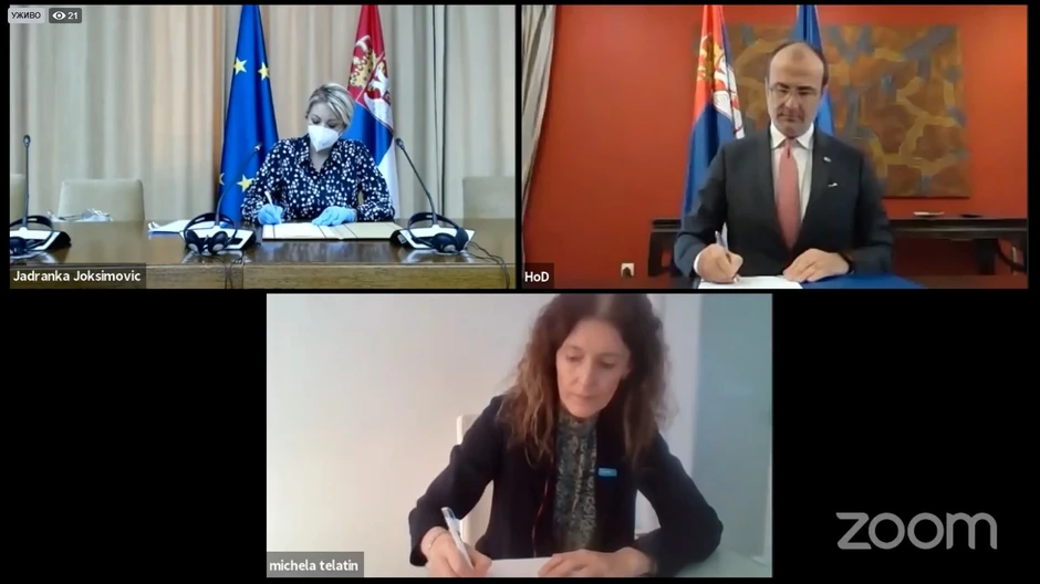 Ministarka za evropske integracije Jadranka Joksimović, ambasador Evropske unije u Srbiji Sem Fabrici i šefica UNOPS kancelarije Mikela Telatin potpisali su danas u Beogradu sporazum o donaciji vrednoj 4,9 miliona evra, za pomoć Srbiji u borbi protiv pandemije KOVID-19.
