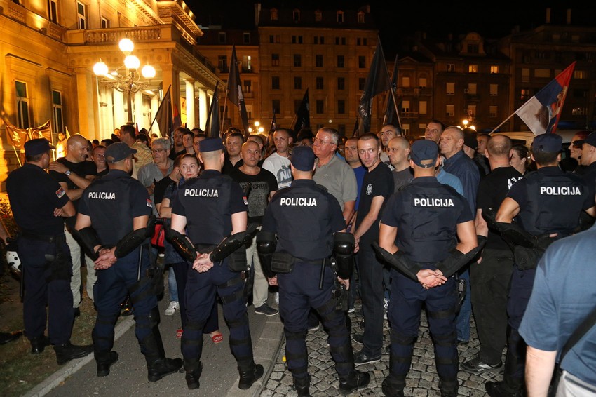 Petnaestak pripadnika ekstremističke organizacije “Zavetnici” došli su u belim majicama sa natpisima “Stop lažima o Srebrenici” transparentom “Srbi su žrtve genocida”.