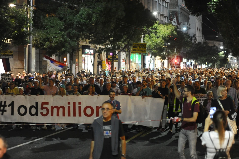 Učesnici protesta "1 od 5 miliona" okupili su se po 41. put u 19 sati na platou ispred Filozofskog fakulteta, odakle su prošetali gradom do Komore izvršitelja.