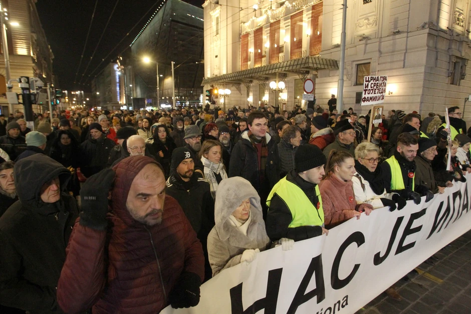 Protest "1 od 5 miliona" održava se večeras u Beogradu po 59. put. Građani su se se, kao i svake subote, okupili u 18 sati na Platou ispred Filozofskog fakulteta, a ovaj put šetnja je bila posvećena Oliveru Ivanoviću, ubijenom lideru Srba sa Kosova i Metohije.