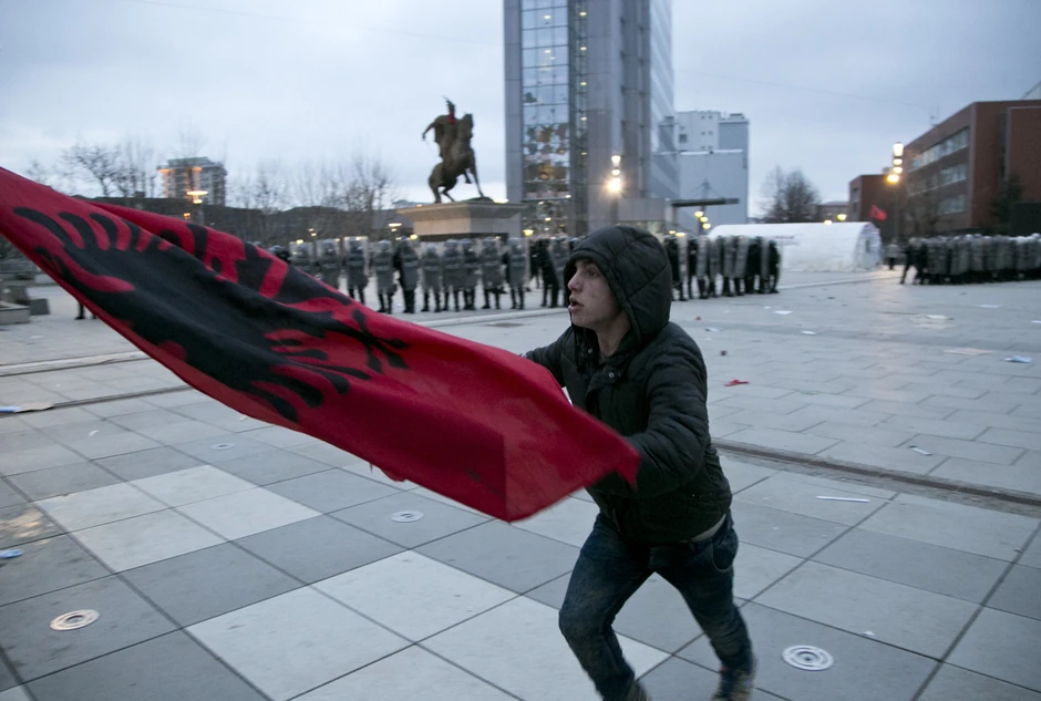Demonstranti su transparente bacili ispred kordona policije kojim je blokiran ulaz u policijsku stanicu u centru grada.