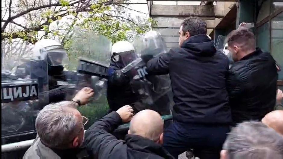 Jednom od policajaca ispao je pištolj tokom guranja sa poslanicima i okupljenim građanima. Kako se vidi na snimku, predsednik Narodnog pokreta Srbije Miroslav Miki Aleksić je napravio prostora kako bi policajac podigao oružje.