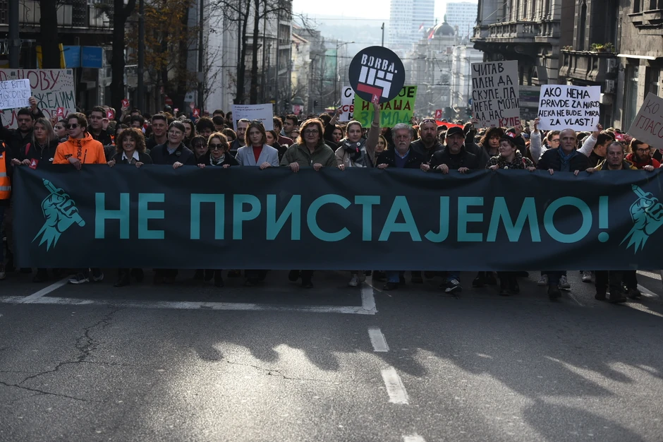 Građani su kratko zastali kod zgrade Predsedništva i RIK-a gde su uzvikivali "Ua, ua" i pokazivali crvene kartone.