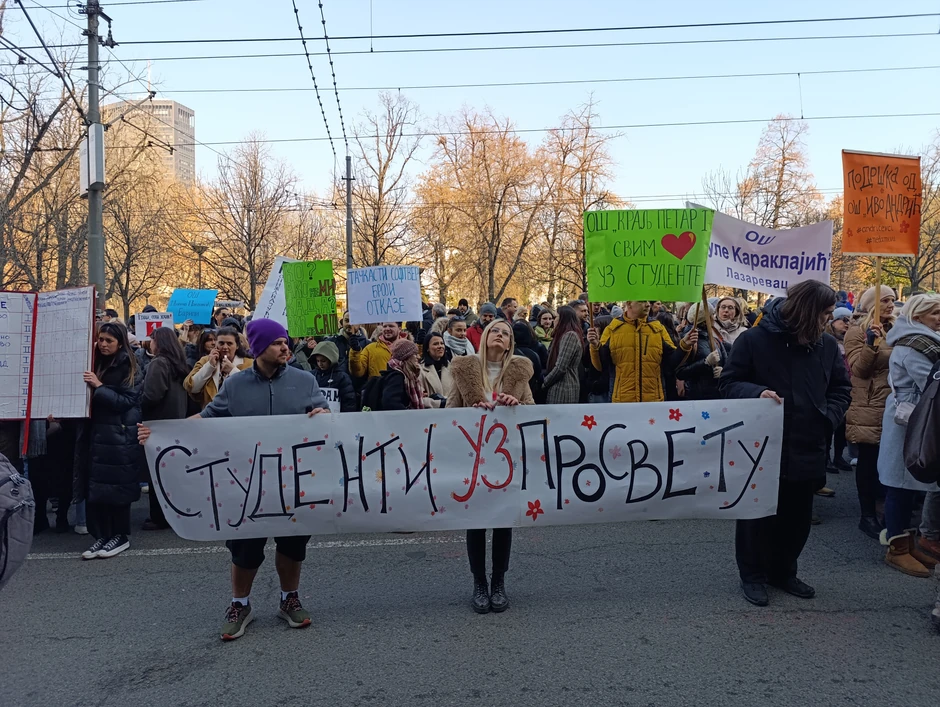 Ispred Ministarstva prosvete u Beogradu održava se protest čiji je inicijator novoformirana mreža "Puls beogradskih osnovnih škola", koja obuhvata škole u potpunoj i delimičnoj obustavi rada. Tu su i građani, studenti i prosvetni radnici, koji su predali svoje zahteve Ministarstvu prosvete, među kojima su veća bezbednost učenika i nastavnika, prestanak targetiranja nastavnika, izmene Zakona o štrajku nastavnika... Zbog protesta blokirana je Nemanjina ulica.