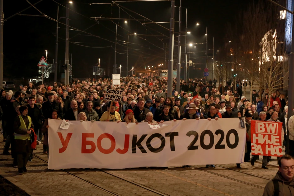 Protesti koji se održavaju svake subote poslednjih više od godinu dana, održan je i večeras na platou ispred Filozofskog fakulteta, ali pod nazivom "U bojkot 2020". Proteste je treći put organizovao "Građanski otpor", nakon što su se iz organizacije povukli aktivisti "1 od 5 miliona". Okupljenima su se obratili profesorka Biljana Stojković i arhitekta Marin Kresić, nakon čega se kolona uputila u šetnju do Savamale.