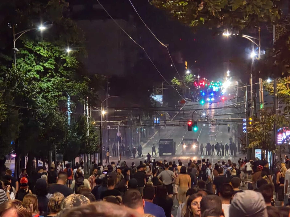 Kordon policije rasporedio se između demonstranata i pristalica SNS u Nemanjinoj ulici. Nešto pre 21 čas poletele su prve kamenice ka pripadnicima MUP.