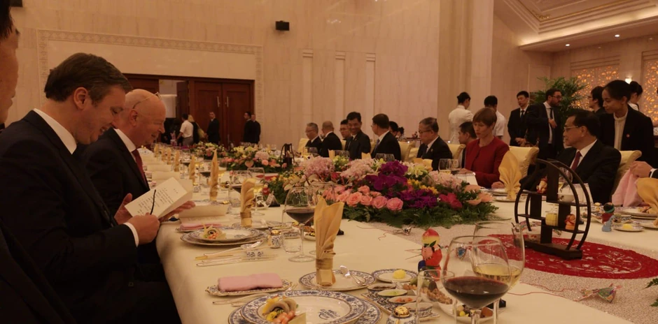 Srpski predsednik Aleksandar Vučić svoju posetu Kini završavama prisustvom na večeri koju je u čast njegovog dolaska organizovao kineski premijer Li Kećang.