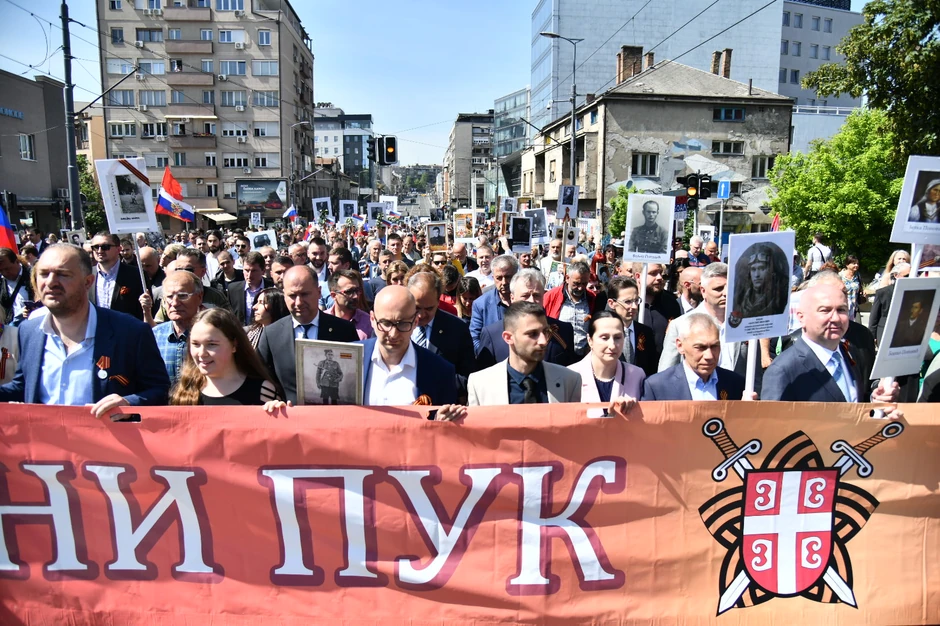 Na čelu kolone je razvijen transparent "Besmrtni puk - Beograd", a okupljeni nose fotografije stradalih u Drugom svetskom ratu, zastave Srbije i Rusije, fotografije ruskog predsednika Vladimira Putina i slovo "Z".