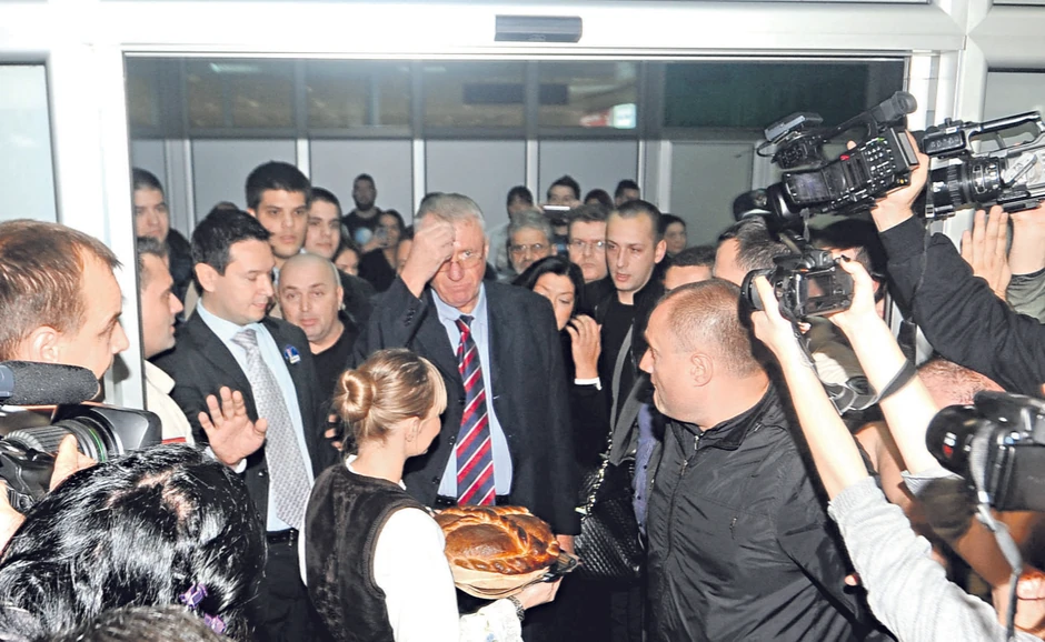 Još žešće je bilo na beogradskom aerodromu, na koji je Šešelj sleteo u 12.56 sati. Kada se, praćen ženom Jadrankom, sinovima, zamenikom predsednika SRS Nemanjom Šarovićem, i nakon što je počašćen hlebom i solju, pojavio pred njima, nekoliko stotina radikala doživelo je ekstazu. Gurali su se da dođu do njega, da ga dodirnu, poljube. Muškarci u transu, žene u suzama tiskale su se oko radikalskog vojvode, a on je bez reči, praktično nošen masom, stigao do automobila koji ga je odvezao do sedišta stranke u Zemunu.