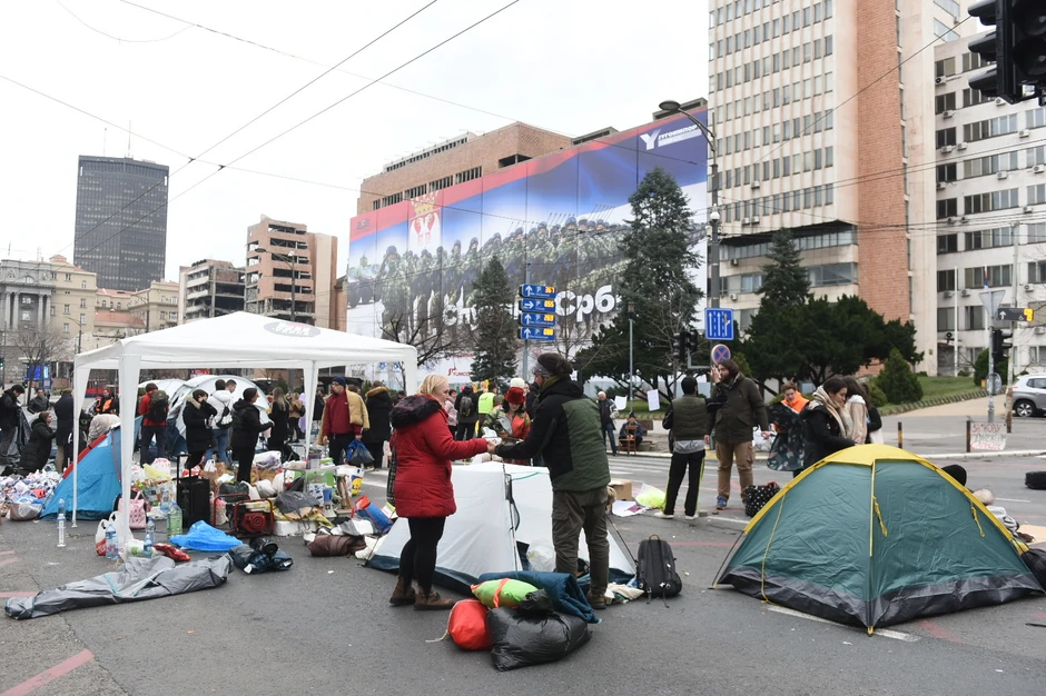 Studenti su se juče u podne okupili na ovom mestu, kada su najavili da će naredna 24 sata provesti noć na tom mestu, gde su napravili improvizovani kamp sa šatorima koje su postavili na ulici.