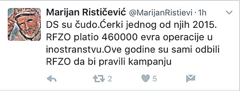 "DS je čudo. Ćerki jednog od njih 2015. RFZO platio 460.000 evra operacije u inostranstvu. Ove godine su sami odbili RFZO da bi pravili kampanju", napisao je Rističević u sramotnom tvitu, koji je u međuvremenu uklonio sa svog Tviter profila.