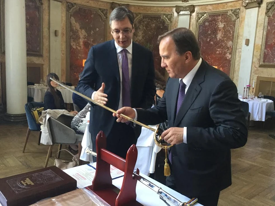 Stefan Leven, švedski premijer, od svog srpskog kolege dobio je na poklon sablju, kao i knjigu o Srbiji i nešto potpuno neočekivano - drvenu dasku i oklagiju.