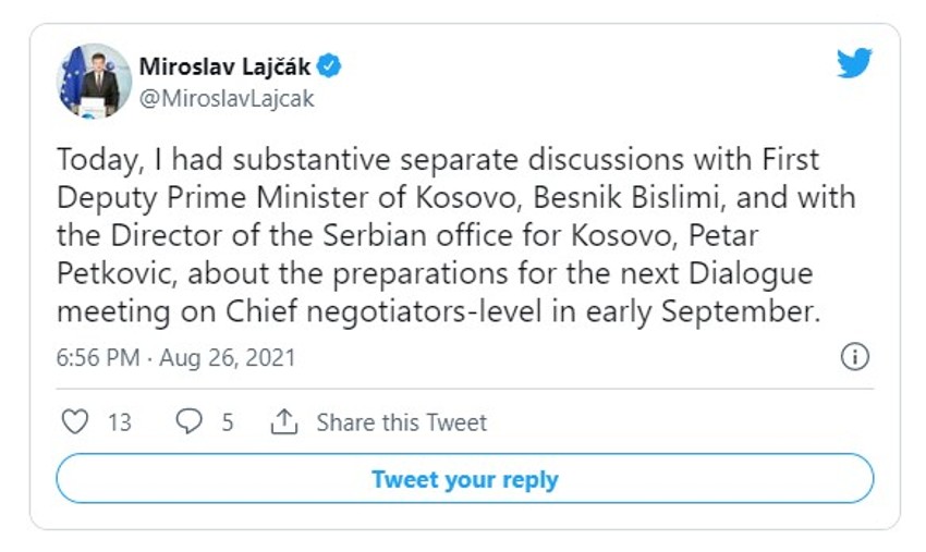 "Danas sam imao značajne, odvojene, razgovore sa prvim zamenikom kosovskog premijera Besnikom Bisljimijem i sa direktorom srpske Kancelarije za Kosovo Petrom Petkovićem o pripremama za sledeći sastanak u okviru dijaloga na nivou glavnih pregovarača početkom septembra", napisao je Lajčak na Tviteru.
