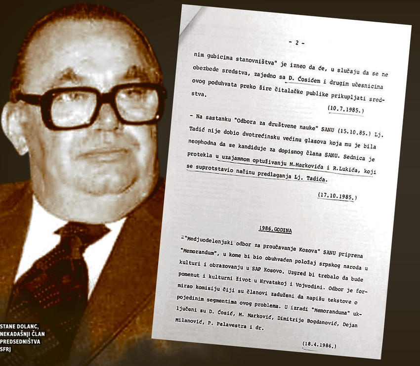 Za ovog doušnika iz SANU sumnja se i da je pustio agente DB da uđu noću u zagradu Akademije i uzmu čuveni nacrt Memoranduma o stanju u Jugoslaviji. “Blic” je već objavio kako su DB i tadašnji svemoćni član Predsedništva SFRJ Stane Dolanc zloupotrebili nikad usvojeni nacrt Memoranduma za napad na SANU. Objavili smo strogo poverljiv izveštaj od 25. septembra 1986, koji je sačinio tadašnji savezni sekretar unutrašnjih poslova (ministar policije SFRJ) Dobrosav Ćulafić za Dolanca.