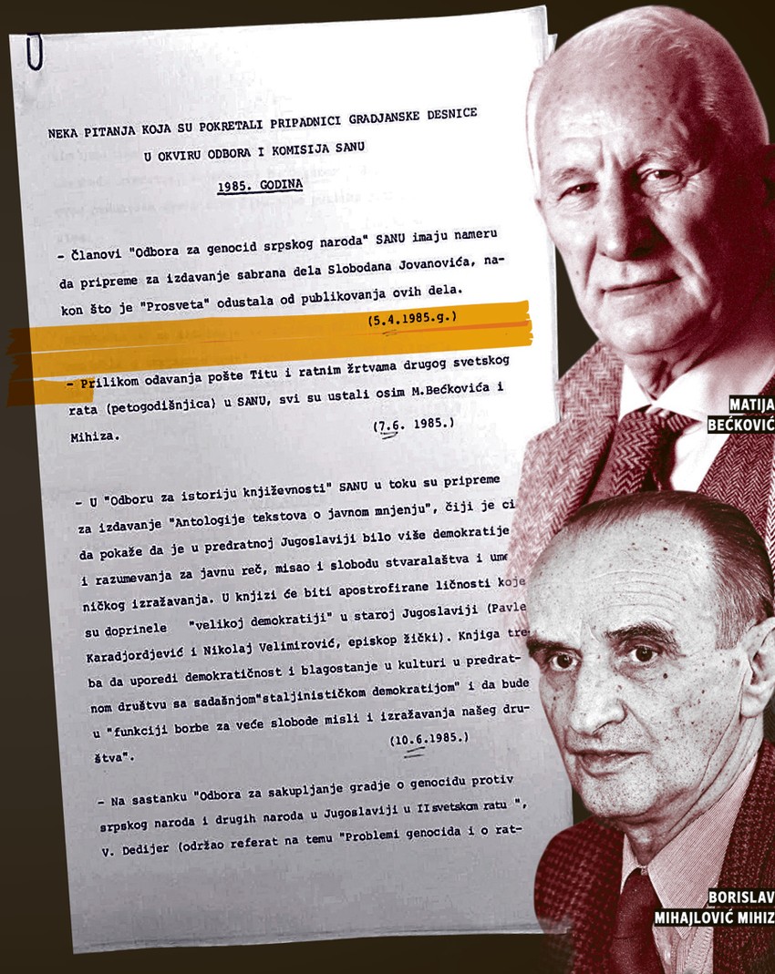 “Na sastanku Odbora V. Dedijer (akademik Vladimir Dedijer, književnik i učesnik NOB) održao je referat na temu ‘Problemi genocida i o ratnim gubicima stanovništva’ i izneo je da će, u slučaju da se ne obezbede sredstva, zajedno sa D. Ćosićem (književnik i akademik Dobrica Ćosić) i drugim učesnicima ovog poduhvata preko šire čitalačke publike prikupljati sredstva”, piše denuncijant.