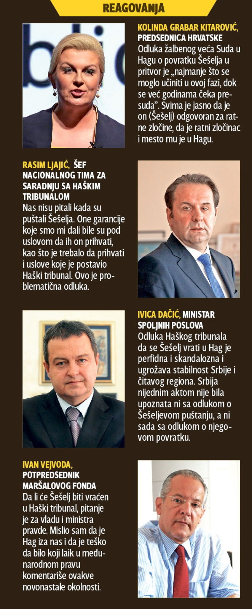 - Srbija će se narednih dana izjasniti o odluci Žalbenog veća Haškog tribunala da se predsednik SRS Vojislav Šešelj vrati u pritvor. Kada bih izgovorio sve što osećam u ovom trenutku, neko bi mislio da nisam u stanju da sakrijem ljutnju i bes zbog nemoralnih odluka koje su neki doneli - rekao je premijer Srbije Aleksandar Vučić.