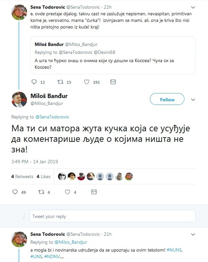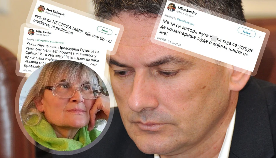 Zamenik gradonačelnika Niša Miloš Banđur izvređao je na Tviteru Senu Todorović, nezavisnu novinarku i osnivača NUNS-a u toku rasprave oko dolaska Putina u Srbiju nazvavši je "ćurkom" i "matorom žutom k****m".