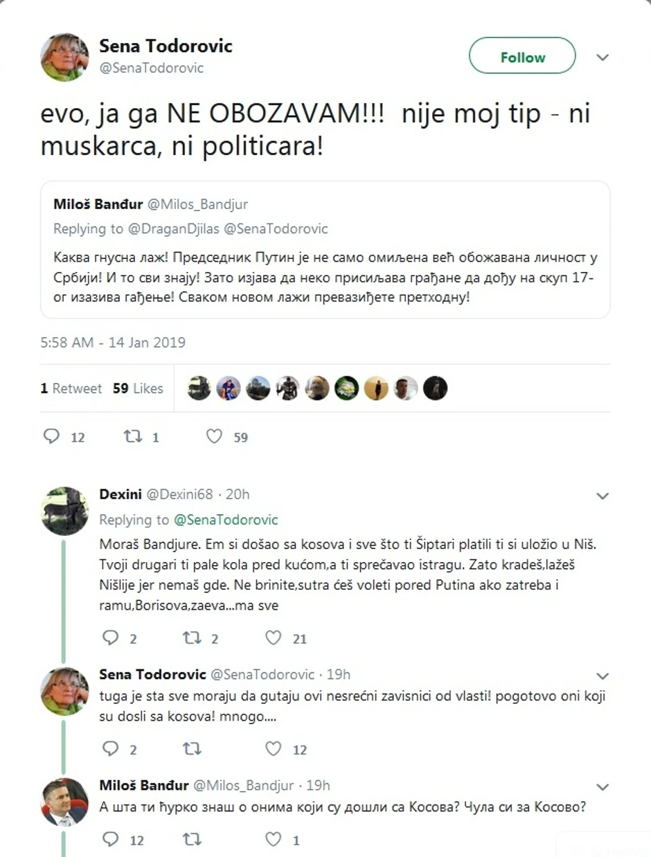- Putin se nasekirao što nije tvoj tip, baš je planirao da te prosi - naveo je Banđur uz smajlije. Onda su se u raspravu uključili i drugi korisnici Tvitera pa su počele prozivke Banđura koji je u Niš došao sa Kosova.
