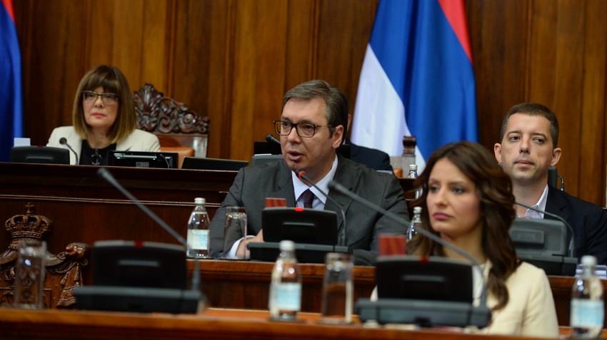 Prvi deo sednice, kojoj je prisustvovao predsednik Srbije Aleksandar Vučić i državni vrh, završena je sinoć. Svi oni i danas dolaze u srpski parlament, gde je oko 10.30 sati tpočelo obraćanje predsednika Srbije.