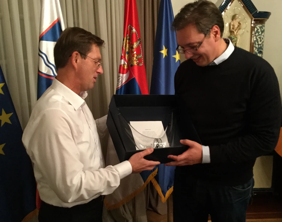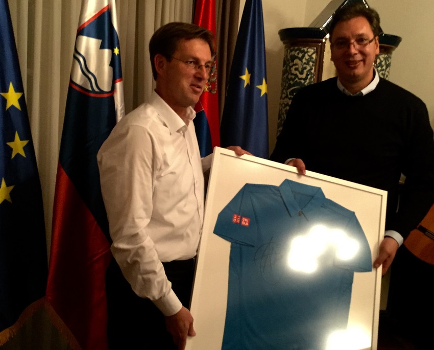 Vučić je Ceraru poklonio potpisani dres Novaka Đokovića, a slovenački premijer Vučiću je darovao dekanter za vino.