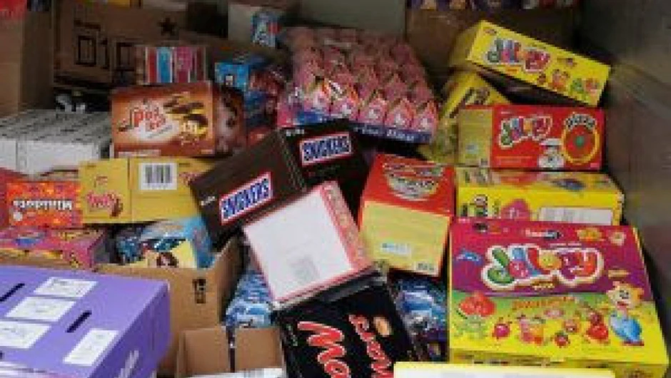 Na fotografijama se vide čokoladice, žuti sok, bombone i žvake.