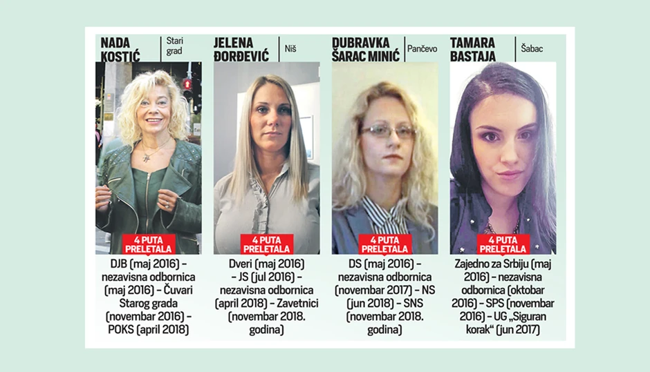 Zanimljivo da su u prvih četiri preletača odbornici koji su čak četiri puta menjali stranku ili status u prethodne tri godine. Reč je o četiri žene, a po karakteru preletanja izdvojila se Dubravka Šarac-Minić, koja je u opštini Pančevo iz tabora DS-a stigla preko nezavisnog statusa i Narodne stranke do - SNS-a.