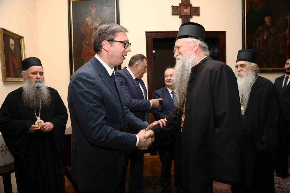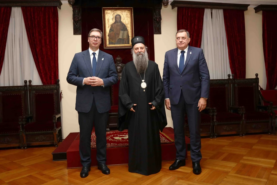 Srpska pravoslavna crkva saopštila je danas da su na sastanku patrijarha Porfirija i članova Sinoda s predsednikom Srbije Aleksandrom Vučićem, svi prisutni izrazili odlučnost da, zalažući se za mir, snažno i zajednički brane vitalne, nacionalne i državne interese.